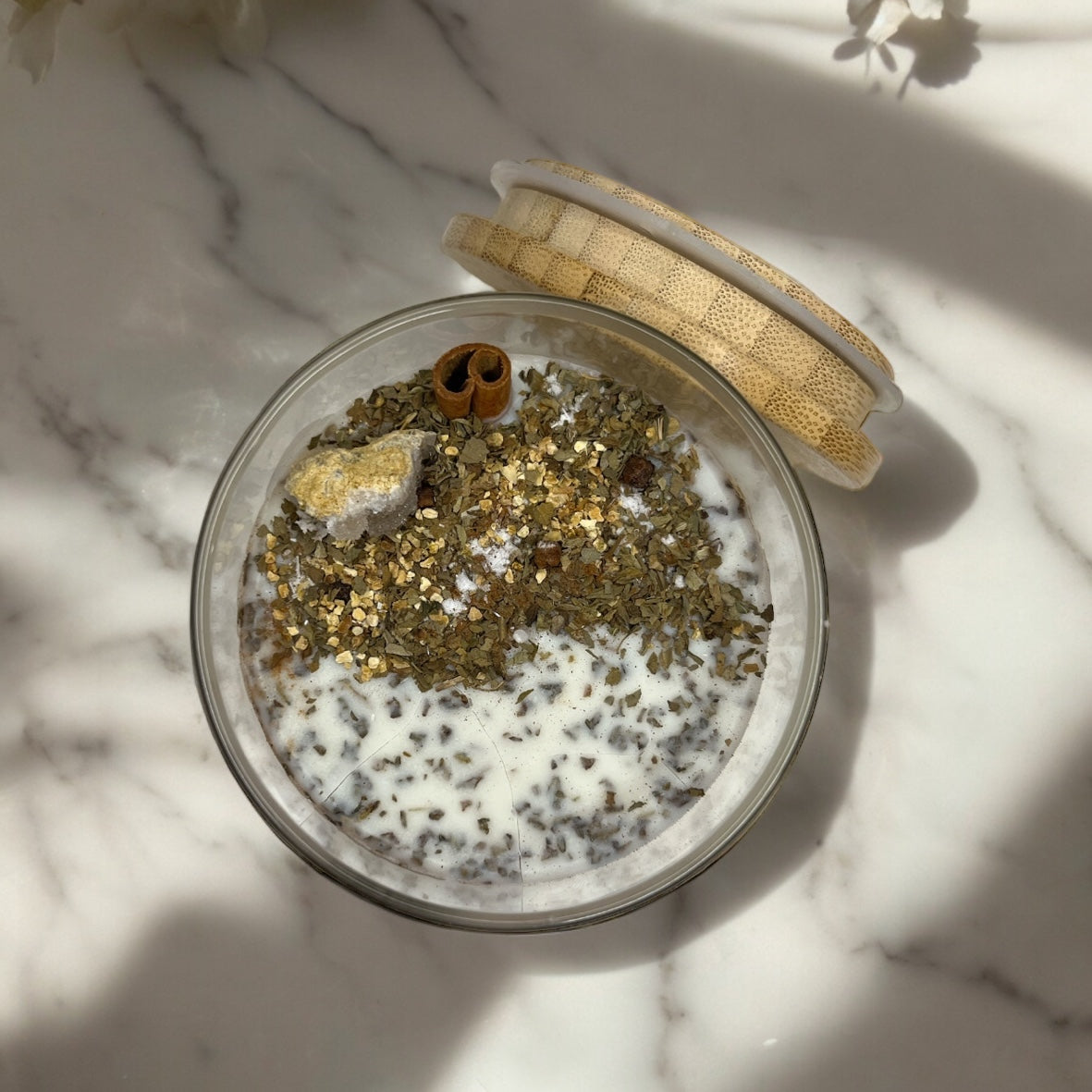 Our handcrafted Cinnamon Apple Candle brings love and comfort to your home and sacred spaces. All candles are made with Raw Crystals, sands, herbs, oils, soy wax and only the purest intentions. May your candle bring you an abundance of blessings.